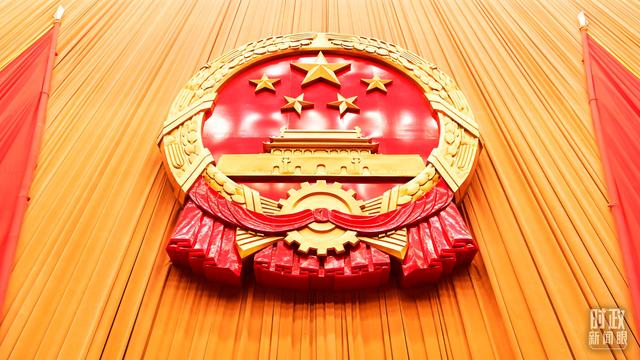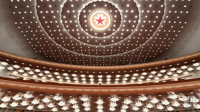 △人民大會(huì)堂內(nèi),國(guó)徽高懸。